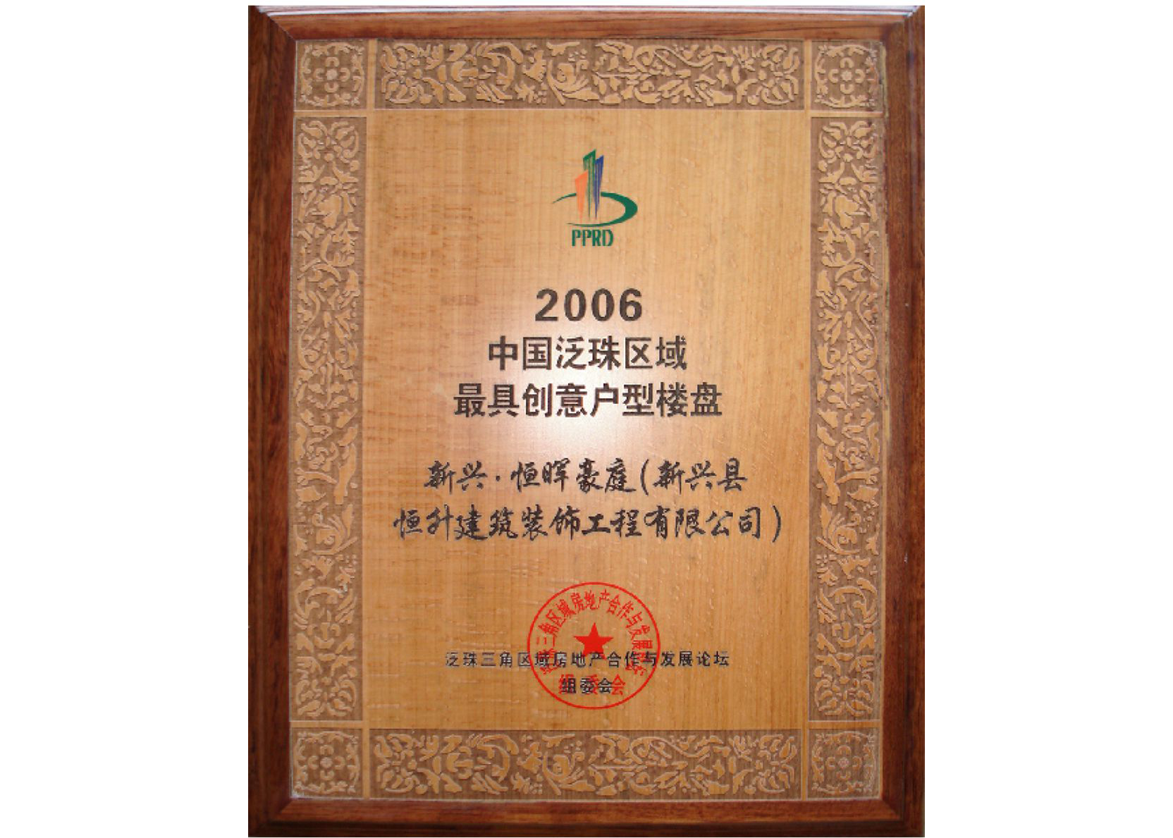 25、2006年12月新兴县恒晖豪庭被泛珠三角区域房地产合作与发展论坛评为“2006中国泛珠区域最具创意户型楼盘”。